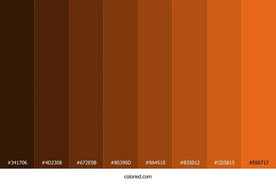 | #672E0B | 103, 46, 11 | 23, 81%, 22% | 0%, 55%, 89%, 60% | oklch(0.374 0.093 47) | |