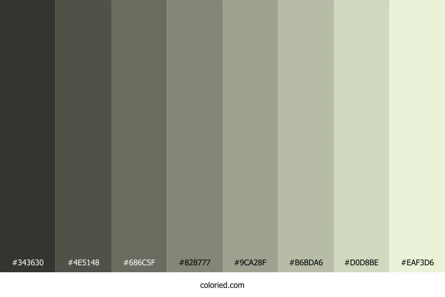 ![]() | #343630 | 52, 54, 48 | 80, 6%, 20% | 4%, 0%, 11%, 79% | oklch(0.329 0.011 122) |