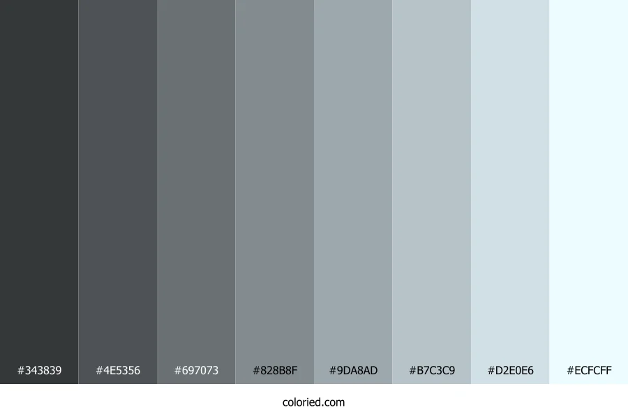 ![]() | #343839 | 52, 56, 57 | 192, 5%, 21% | 9%, 2%, 0%, 78% | oklch(0.337 0.006 215) |