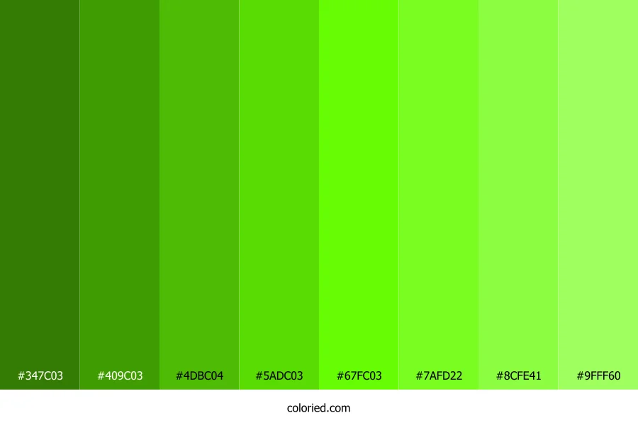 | #67FC03 | 103, 252, 3 | 96, 98%, 50% | 59%, 0%, 99%, 1% | oklch(0.874 0.271 138) | |