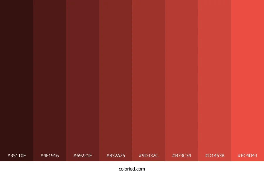 ![]() | #35110F | 53, 17, 15 | 3, 56%, 13% | 0%, 68%, 72%, 79% | oklch(0.235 0.059 26) |