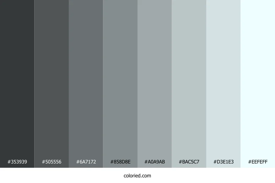 | #858D8E | 133, 141, 142 | 187, 4%, 54% | 6%, 1%, 0%, 44% | oklch(0.637 0.010 206) | |
