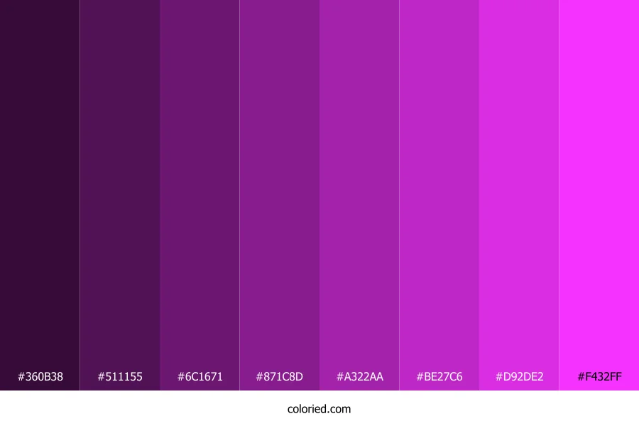| #F432FF | 244, 50, 255 | 297, 100%, 60% | 4%, 80%, 0%, 0% | oklch(0.700 0.299 326) |