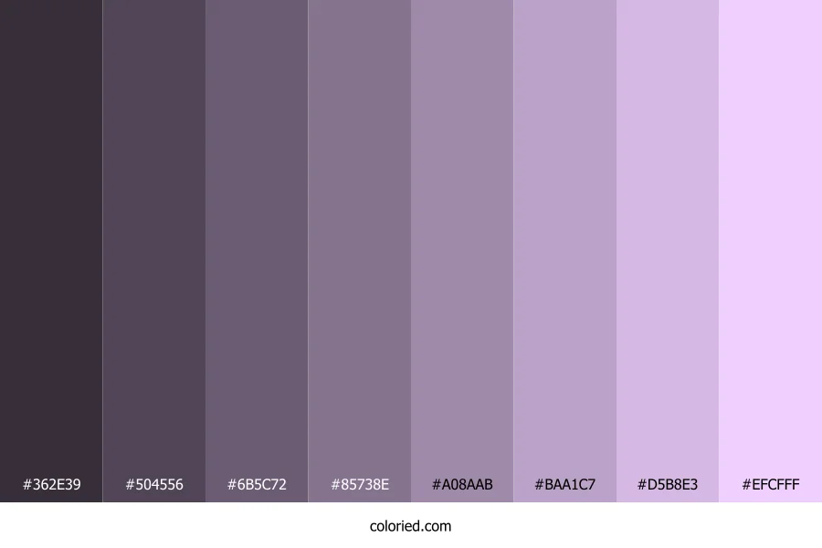 ![]() | #362E39 | 54, 46, 57 | 284, 11%, 20% | 5%, 19%, 0%, 78% | oklch(0.314 0.022 317) |