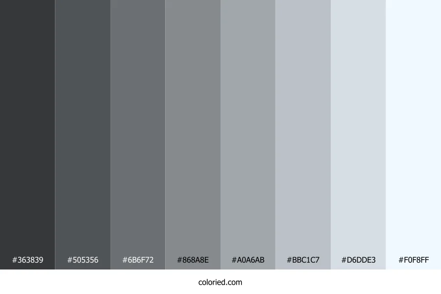 ![]() | #363839 | 54, 56, 57 | 200, 3%, 22% | 5%, 2%, 0%, 78% | oklch(0.339 0.003 229) |