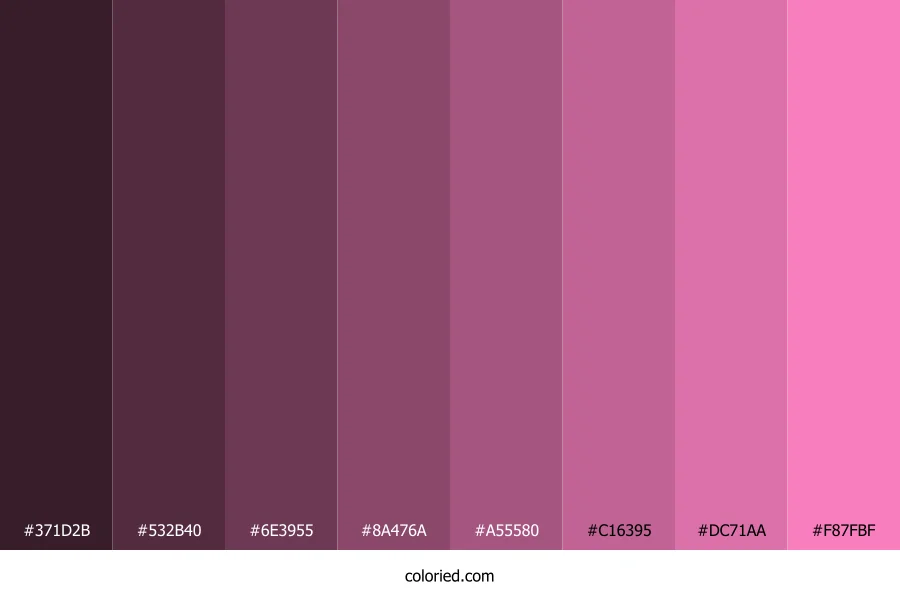 ![]() | #371D2B | 55, 29, 43 | 328, 31%, 16% | 0%, 47%, 22%, 78% | oklch(0.271 0.046 347) |