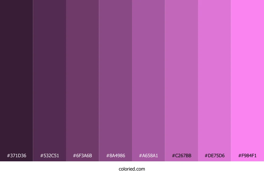 ![]() | #371D36 | 55, 29, 54 | 302, 31%, 16% | 0%, 47%, 2%, 78% | oklch(0.277 0.057 328) |