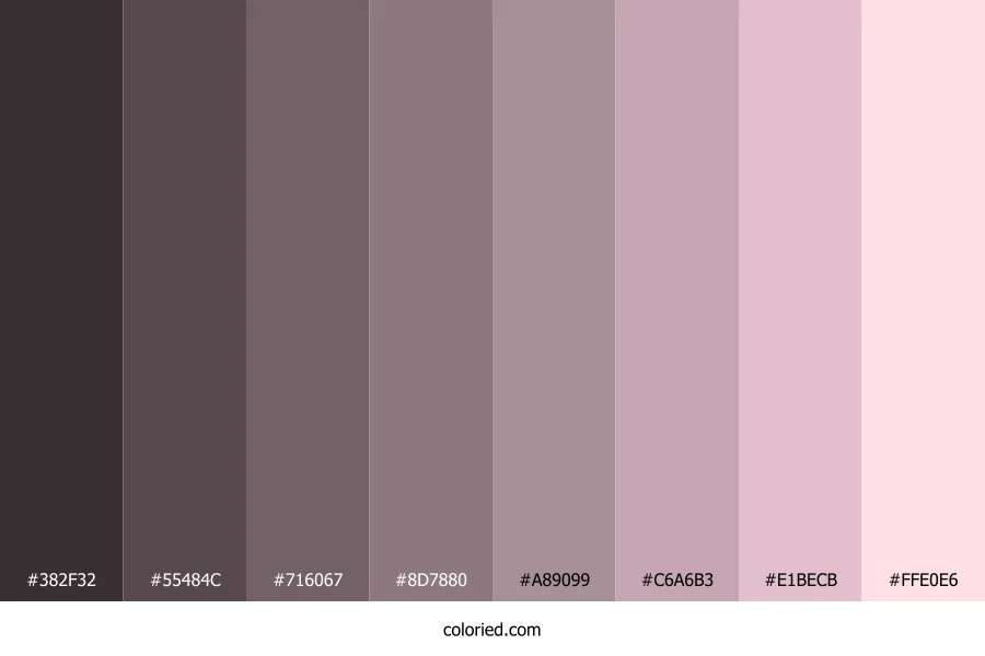 ![]() | #382F32 | 56, 47, 50 | 340, 9%, 20% | 0%, 16%, 11%, 78% | oklch(0.316 0.014 356) |