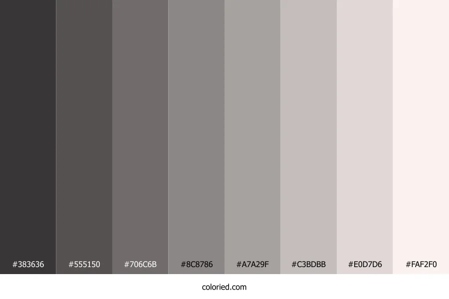 | #8C8786 | 140, 135, 134 | 10, 3%, 54% | 0%, 4%, 4%, 45% | oklch(0.627 0.006 31) | |