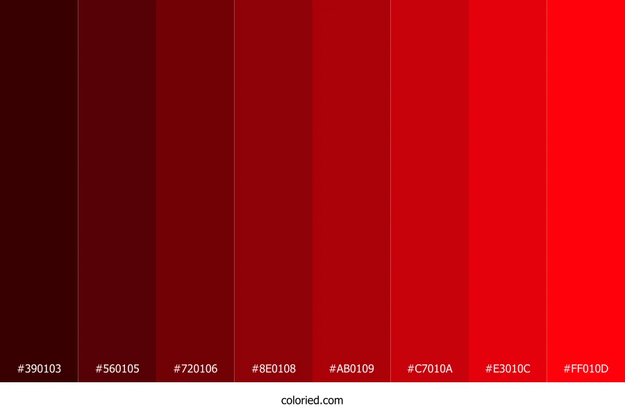 | #FF010D | 255, 1, 13 | 357, 100%, 50% | 0%, 100%, 95%, 0% | oklch(0.628 0.257 29) |