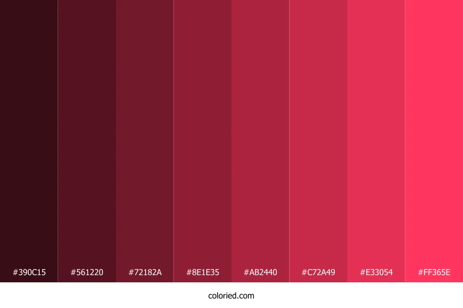 ![]() | #390C15 | 57, 12, 21 | 348, 65%, 14% | 0%, 79%, 63%, 78% | oklch(0.237 0.071 13) |