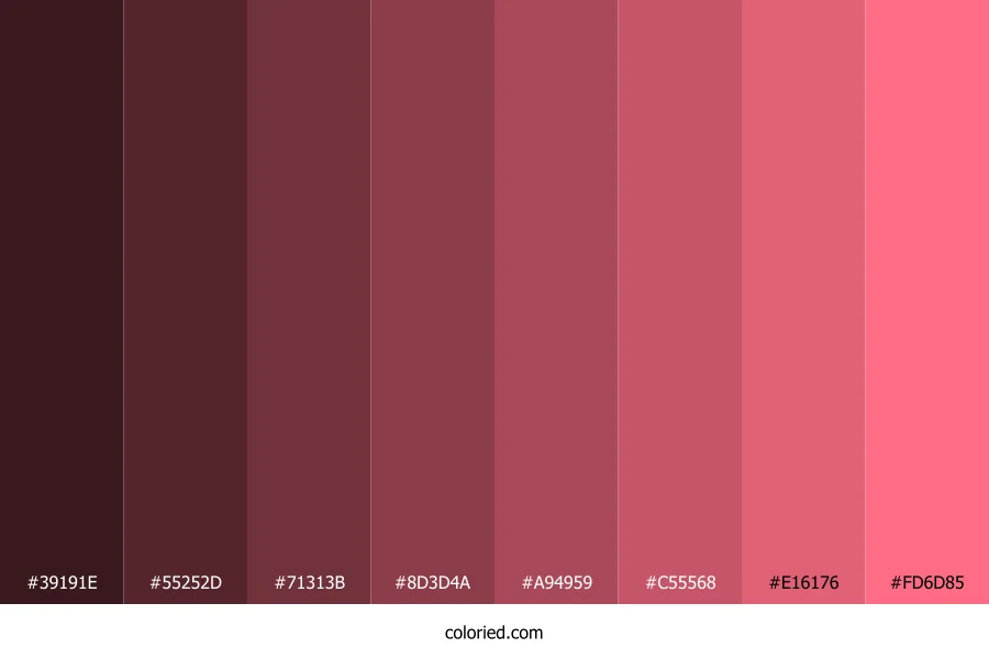 ![]() | #39191E | 57, 25, 30 | 351, 39%, 16% | 0%, 56%, 47%, 78% | oklch(0.261 0.051 11) |