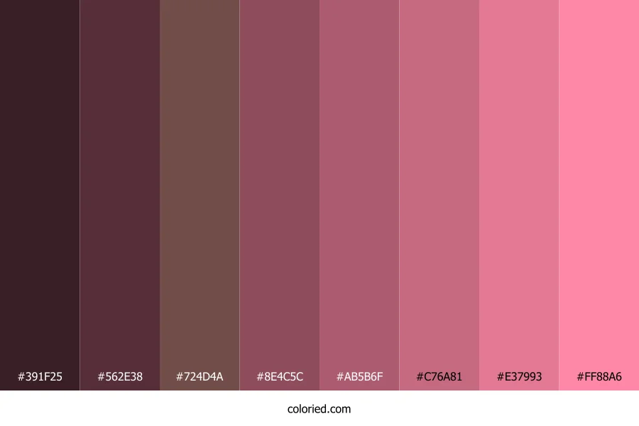 ![]() | #391F25 | 57, 31, 37 | 346, 30%, 17% | 0%, 46%, 35%, 78% | oklch(0.276 0.041 5) |