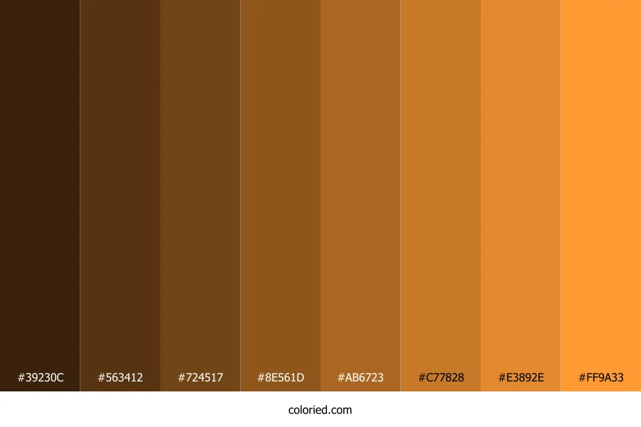 | #8E561D | 142, 86, 29 | 30, 66%, 34% | 0%, 39%, 80%, 44% | oklch(0.507 0.102 62) | |