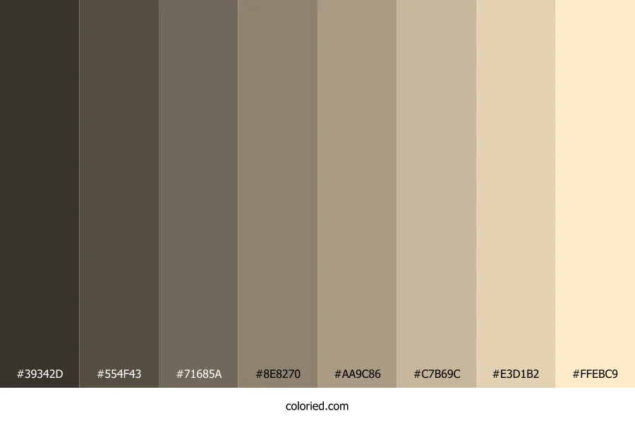| #8E8270 | 142, 130, 112 | 36, 12%, 50% | 0%, 8%, 21%, 44% | oklch(0.612 0.030 78) | |