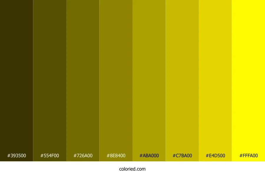 ![]() | #393500 | 57, 53, 0 | 56, 100%, 11% | 0%, 7%, 100%, 78% | oklch(0.323 0.068 105) |