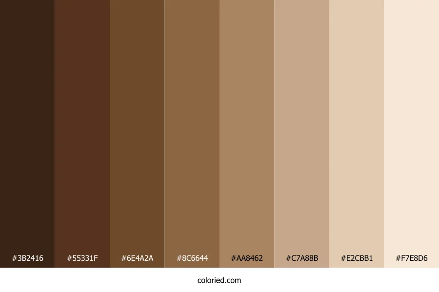 | #AA8462 | 170, 132, 98 | 28, 30%, 53% | 0%, 22%, 42%, 33% | oklch(0.641 0.067 63) | |