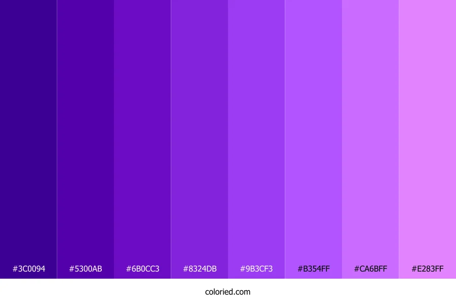 | #8324DB | 131, 36, 219 | 271, 72%, 50% | 40%, 84%, 0%, 14% | oklch(0.514 0.248 301) | |
