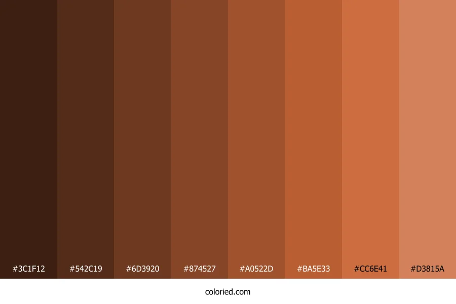 | #A0522D | 160, 82, 45 | 19, 56%, 40% | 0%, 49%, 72%, 37% | oklch(0.526 0.115 45) | |