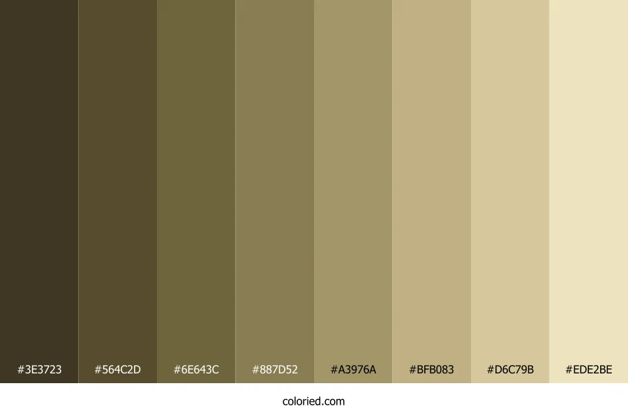 | #887D52 | 136, 125, 82 | 48, 25%, 43% | 0%, 8%, 40%, 47% | oklch(0.589 0.062 96) | |