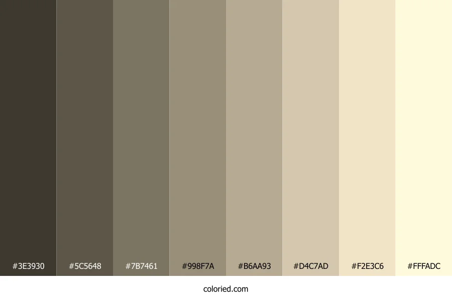 | #998F7A | 153, 143, 122 | 41, 13%, 54% | 0%, 7%, 20%, 40% | oklch(0.653 0.032 86) | |