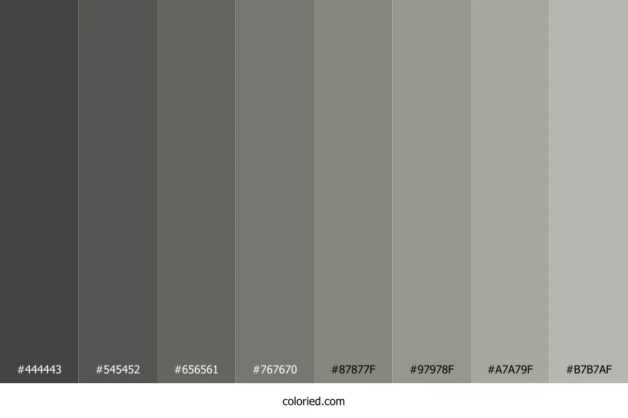 ![]() | #444443 | 68, 68, 67 | 60, 1%, 26% | 0%, 0%, 1%, 73% | oklch(0.386 0.002 107) |