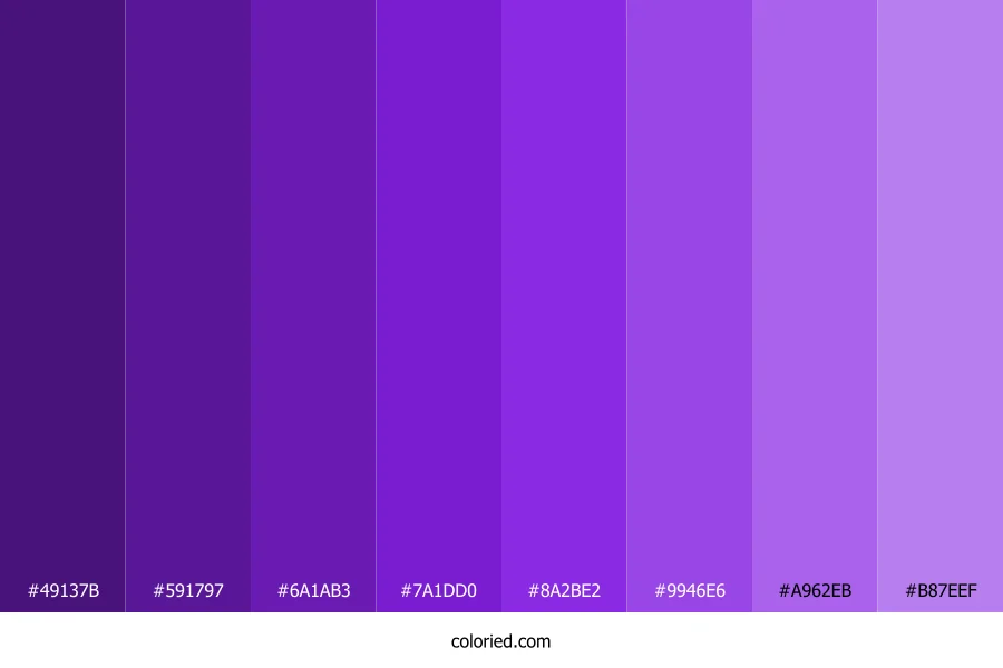 | #8A2BE2 | 138, 43, 226 | 271, 76%, 53% | 39%, 81%, 0%, 11% | oklch(0.534 0.250 301) | |