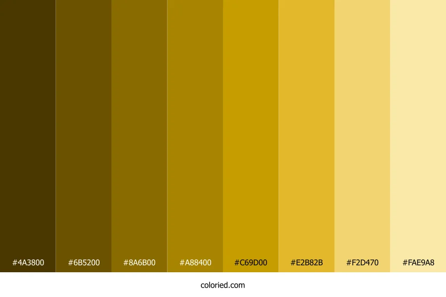 | #8A6B00 | 138, 107, 0 | 47, 100%, 27% | 0%, 22%, 100%, 46% | oklch(0.543 0.111 89) | |