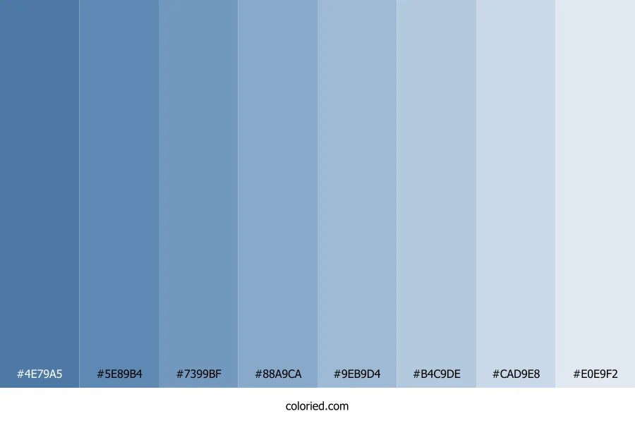 | #9EB9D4 | 158, 185, 212 | 210, 39%, 73% | 25%, 13%, 0%, 17% | oklch(0.775 0.049 248) | |