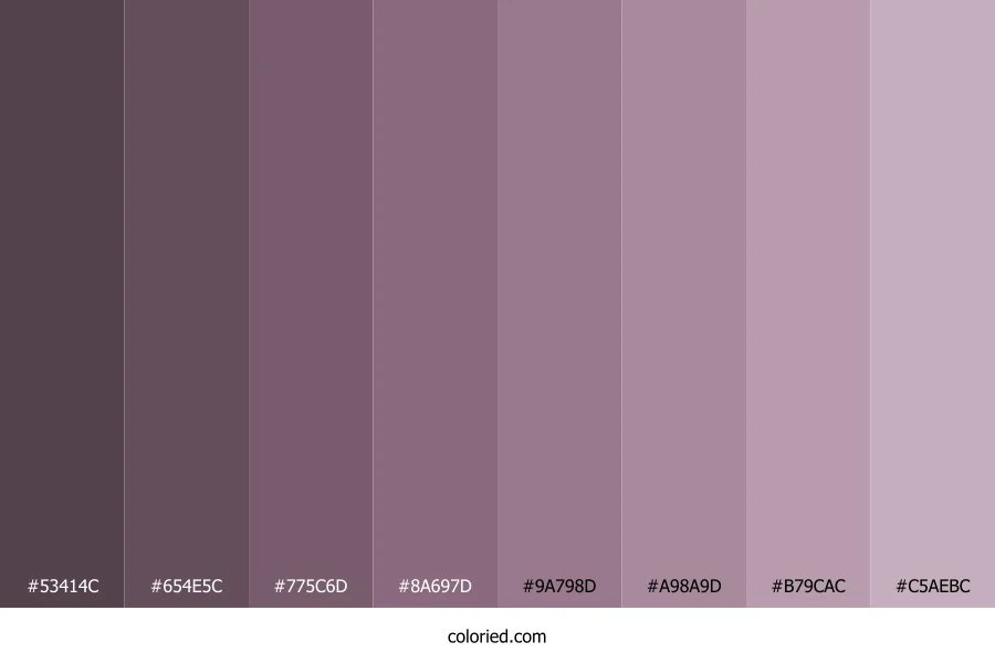 ![]() | #53414C | 83, 65, 76 | 323, 12%, 29% | 0%, 22%, 8%, 67% | oklch(0.398 0.030 341) |