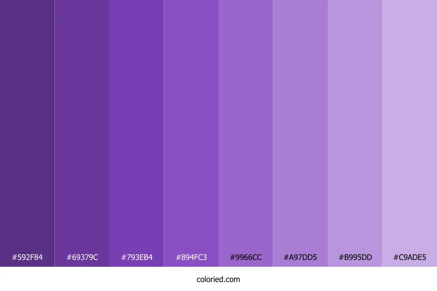 | #9966CC | 153, 102, 204 | 270, 50%, 60% | 25%, 50%, 0%, 20% | oklch(0.608 0.156 305) | |