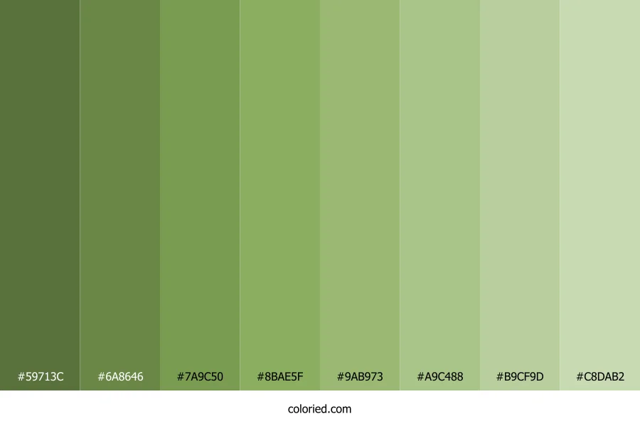 | #9AB973 | 154, 185, 115 | 87, 33%, 59% | 17%, 0%, 38%, 27% | oklch(0.746 0.101 128) | |