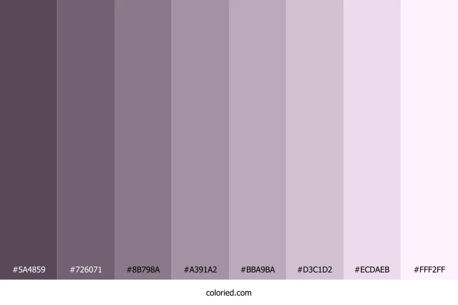 ![]() | #5A4859 | 90, 72, 89 | 303, 11%, 32% | 0%, 20%, 1%, 65% | oklch(0.427 0.036 328) |