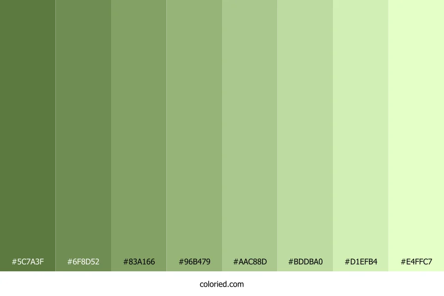 | #BDDBA0 | 189, 219, 160 | 91, 45%, 74% | 14%, 0%, 27%, 14% | oklch(0.855 0.085 130) | |