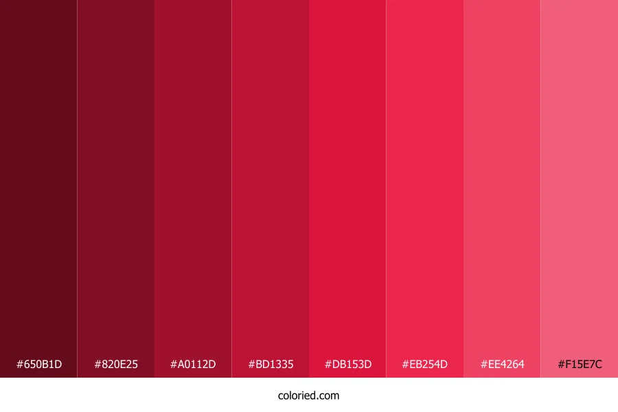 | #BD1335 | 189, 19, 53 | 348, 82%, 41% | 0%, 90%, 72%, 26% | oklch(0.512 0.197 19) | |