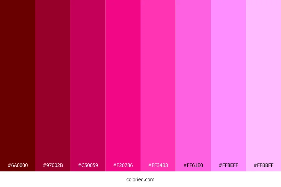 | #F20786 | 242, 7, 134 | 328, 94%, 49% | 0%, 97%, 45%, 5% | oklch(0.625 0.252 358) | |