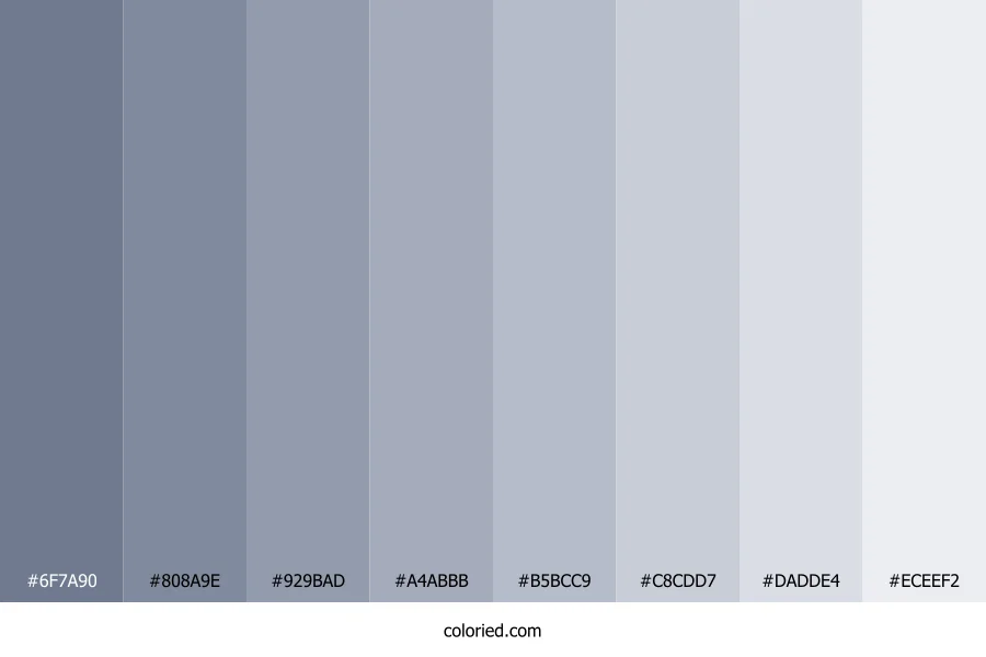 ![]() | #6F7A90 | 111, 122, 144 | 220, 13%, 50% | 23%, 15%, 0%, 44% | oklch(0.578 0.036 264) |