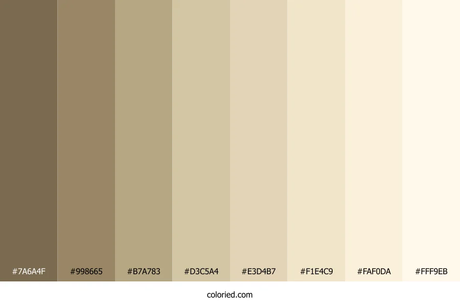 ![]() | #7A6A4F | 122, 106, 79 | 38, 21%, 39% | 0%, 13%, 35%, 52% | oklch(0.532 0.045 81) |