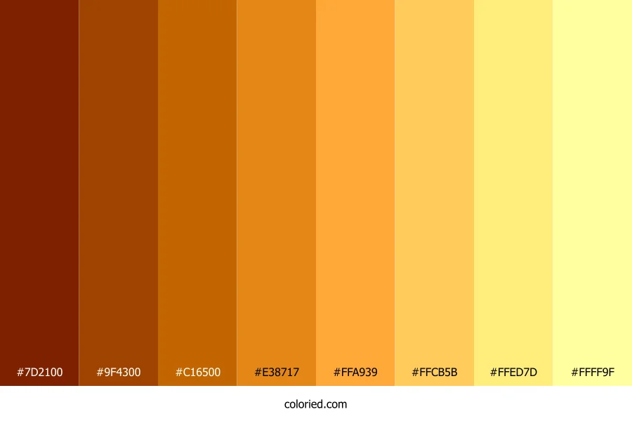 | #9F4300 | 159, 67, 0 | 25, 100%, 31% | 0%, 58%, 100%, 38% | oklch(0.498 0.138 47) | |