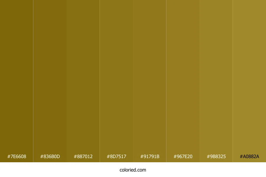 | #8D7517 | 141, 117, 23 | 48, 72%, 32% | 0%, 17%, 84%, 45% | oklch(0.569 0.109 93) | |