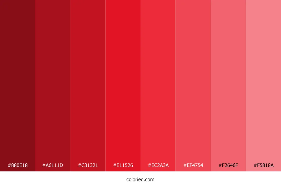 ![]() | #880E18 | 136, 14, 24 | 355, 81%, 29% | 0%, 90%, 82%, 47% | oklch(0.402 0.153 25) |