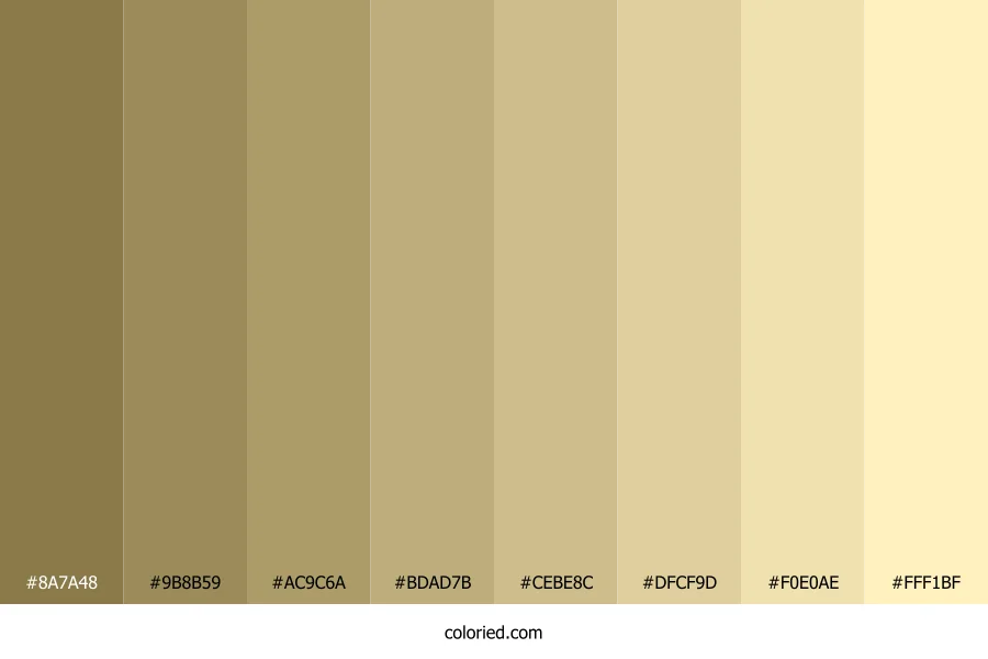 | #9B8B59 | 155, 139, 89 | 45, 27%, 48% | 0%, 10%, 43%, 39% | oklch(0.639 0.071 92) | |