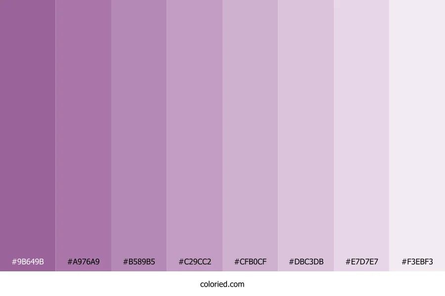 ![]() | #9B649B | 155, 100, 155 | 300, 22%, 50% | 0%, 35%, 0%, 39% | oklch(0.582 0.104 327) |