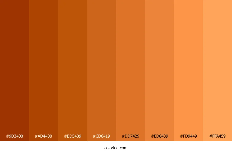 ![]() | #9D3400 | 157, 52, 0 | 20, 100%, 31% | 0%, 67%, 100%, 38% | oklch(0.474 0.149 40) |