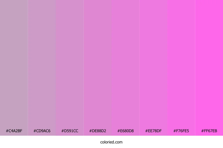 | #E680D8 | 230, 128, 216 | 308, 67%, 70% | 0%, 44%, 6%, 10% | oklch(0.740 0.165 332) | |