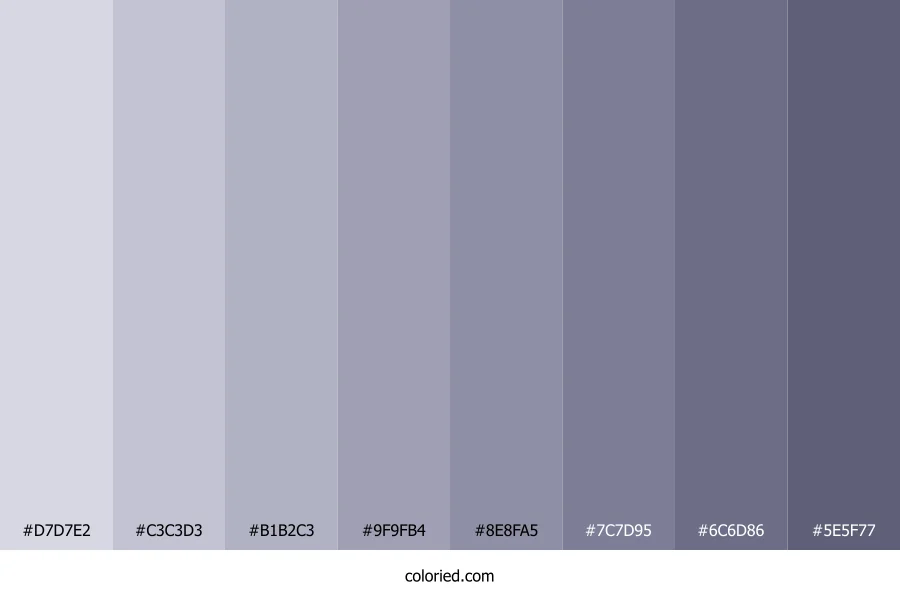 | #5E5F77 | 94, 95, 119 | 238, 12%, 42% | 21%, 20%, 0%, 53% | oklch(0.494 0.038 283) |