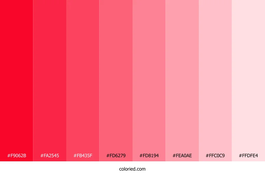 ![]() | #F9062B | 249, 6, 43 | 351, 95%, 50% | 0%, 98%, 83%, 2% | oklch(0.620 0.250 25) |