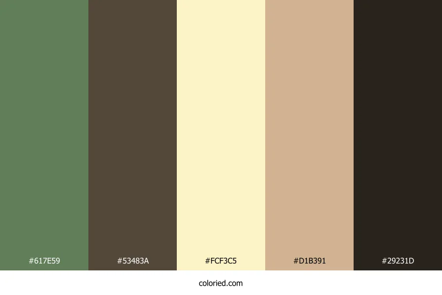 | #53483A | 83, 72, 58 | 34, 18%, 28% | 0%, 13%, 30%, 67% | oklch(0.409 0.027 74) | |