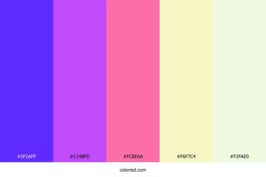 ![]() | #5F2AFF | 95, 42, 255 | 255, 100%, 58% | 63%, 84%, 0%, 0% | oklch(0.517 0.279 282) |