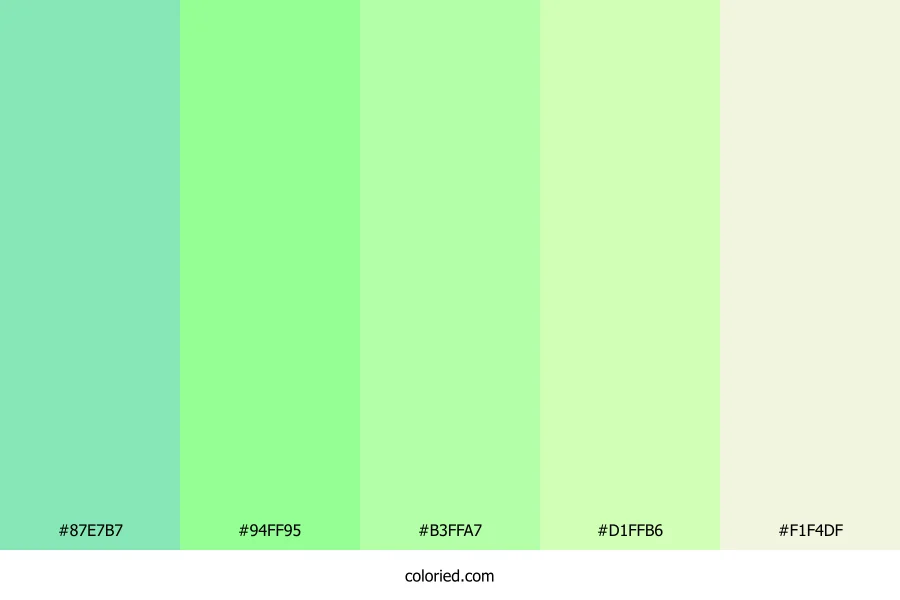 | #D1FFB6 | 209, 255, 182 | 98, 100%, 86% | 18%, 0%, 29%, 0% | oklch(0.950 0.106 134) | |